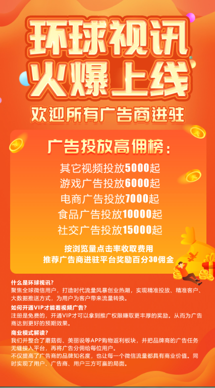 环球视讯Ai智能联合5G信息技术公司,我们并整合了蘑菇街、美丽说等APP购物返利板块。并把品牌商的广告任务无缝接入平台,再将平台内投放的广告费用分佣出来,