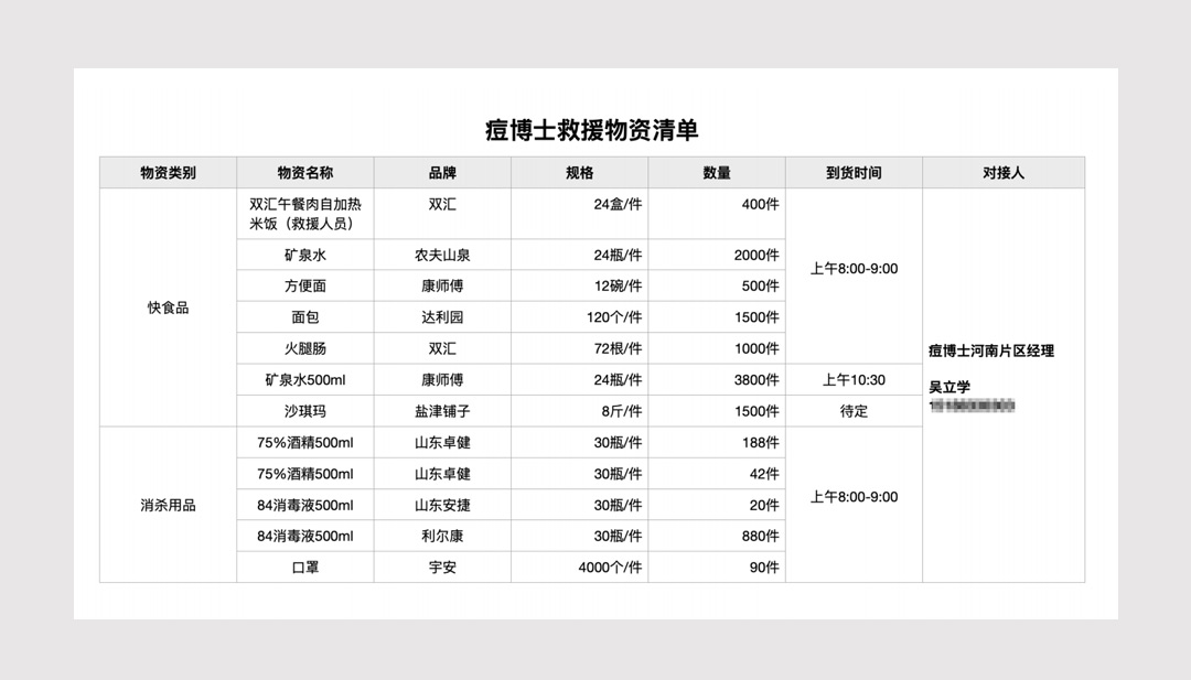 即刻联络痘博士郑州分区负责人,求助业绩斐然的社会救援组织“狮子会”郑州分部,迅速了解反馈灾情和当地群众最为紧关急要的生活物品需求,为下一步物资筹集的品种数量提供精准的信息定位。在痘博士“援助河南水患统筹小组”高效运作下,各路一手灾区需求信息接连不断,纷至沓来。