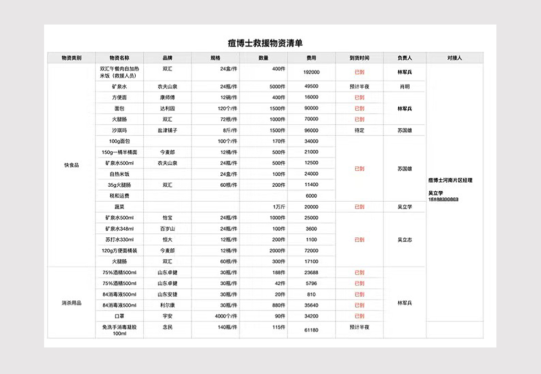 痘博士留下了这样一份清单——筹集矿泉水、方便面、面包、自热米饭、火腿肠等快食品以及84消毒液、救生衣等消杀救生用品送往河南水患灾区,价值人民币1002514元。