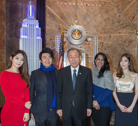 10月23日,为庆祝联合国成立70周年,国际钢琴巨星、联合国和平使者郎朗与联合国秘书长潘基文、韩国女子流行演唱团体Davichi共同在纽约帝国大厦出席了“环球点亮联合国蓝”活动。