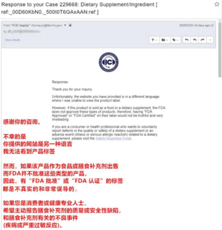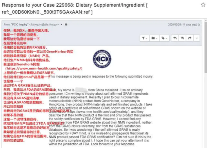 公开资料显示,FDA严格规定“不得使用FDA的徽标歪曲该机构或暗示FDA认可任何私人组织,产品或服务”。而基因港在网络、京东旗舰店、产品包装上宣传并展示“FDA GRAS证书”,存在欺骗消费者行为,而造假证书更涉嫌虚假宣传。国内已有消费者向FDA发邮件确认基因港“FDA GRAS证书”真实性,FDA回复:“有FDA批准或FDA认证的标签都是不真实的和非常误导的”。再次证明基因港“FDA GRAS证书”是伪造的。