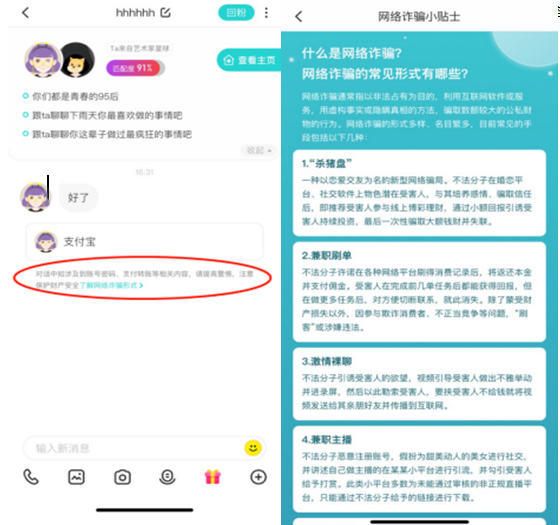 目前,Soul采用人工机器双审核机制,实时识别风险内容。在聊天场景中,Soul也设置了大量强提醒,提高用户对诈骗犯罪的警惕。如聊天中出现“转账”等敏感字眼,将在聊天页面出现显著标识,提醒用户注意防范诈骗,并设置专门团队第一时间响应用户举报,核查并封锁涉嫌诈骗的账号。因Soul平台上不具备转账功能,不法分子在Soul接触用户后,通常会将关系引流到其他平台以进一步实施诈骗。因此,如聊天消息中含有明显导流意向时,系统将为消息接收方屏蔽此条消息,接收方只有在通过防诈骗知识答题、充分了解诈骗风险后,方可解锁阅读此条消息。而用户若收到“转账”、“微信”、“支付宝”等高危内容,相关消息下方将出现对应的反诈骗提醒。