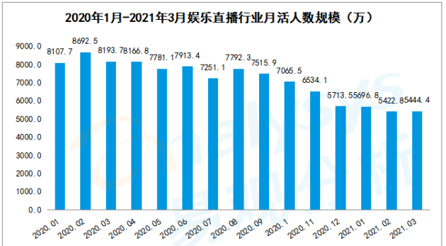 1月初,用户面临企业年终考核、期末等压力,娱乐时间相对压缩,春节期间,线下娱乐复苏,各类活动抢占线上文娱时间,用户观看直播的热情有所减弱。2月底开始,用户开始恢复工作与生活节奏,利用线上娱乐时间放松,娱乐直播用户规模有所回升,环比增长0.40%。