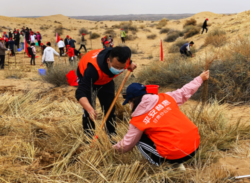 阳和启蛰,品物皆春,但位于腾格里沙漠边缘的八步沙林场却仍是寒气袭人、大风呼啸。近日,兰州市工商联(总商会)、兰州日报社携手平安普惠甘肃分公司及兰州市各行各业的党员、企业家、志愿者、热心市民共300余人走进甘肃省武威市古浪县八步沙林场,开展“红心永向党 播绿八步沙”云植树主题公益党建活动。300余名党员志愿者、热心市民扛起铁锨,开挖沙沟、摊铺稻草、填沙扶草……,在连绵起伏的沙丘上,筑起一道道渐次延伸的绿色屏障。在“八步沙精神”的发源地甘肃省武威市古浪县八步沙林场,传承“红色精神”,厚植“绿的底色”。