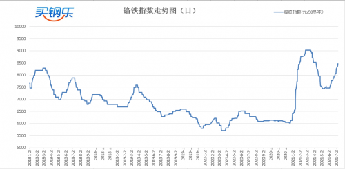 3、铬铁:本周铬铁受生产国疫情和国内仍然限电影响,库存下降较快,铬铁进行保持上涨态势。买钢乐高碳铬铁指数价格收于8463元/50基吨,较上周上涨200元/50基吨,涨幅2.42%。