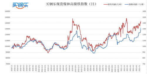 买钢乐高镍铁指数收于1318元/镍,较上周上涨79元/镍,涨幅06.38%;电解镍指数收于143500元/吨,较上周上涨4125元/吨,涨幅2.96%。