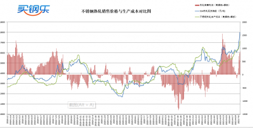 不锈钢使用高镍铁+镍板工艺冶炼304热轧生产成本约为17120元/吨,热轧销售价格高于生产成本880元/吨。