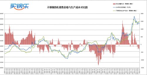 不锈钢使用高镍铁+镍板工艺冶炼304热轧生产成本约为18520元/吨,热轧销售价格低于生产成本320元/吨。