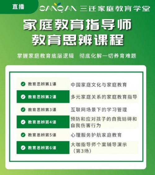 赛:每周家庭教育指导实操秀,最后6天半决赛决赛的较量,让你迅速成为家庭教育指导高手。