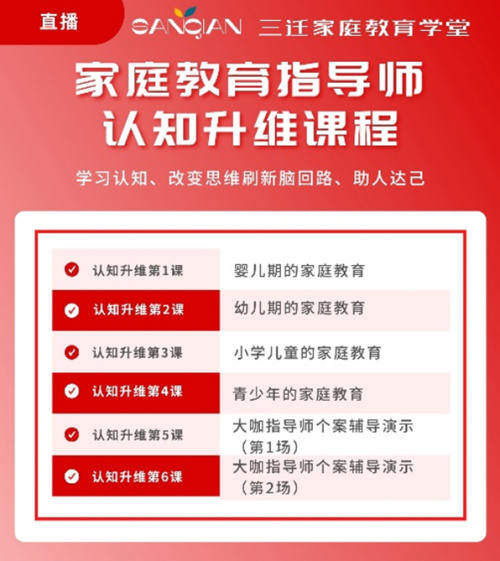 赛:每周家庭教育指导实操秀,最后6天半决赛决赛的较量,让你迅速成为家庭教育指导高手。