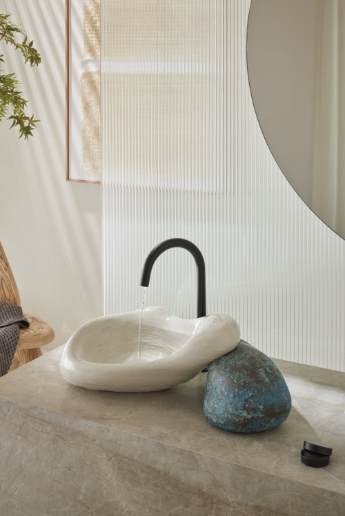 Rock.01延续了Arsham许多作品对时光致敬的概念,台盆部分由3D打印釉面陶瓷和手工浇灌黄铜所构成,将现代科技与科勒近148年的制造传统融为一体,体现了功能性和高雅艺术的完美结合。经过强压工艺锻造的黄铜“岩石”泛出怀旧的铜绿光泽,正传递了时光刻画的痕迹。