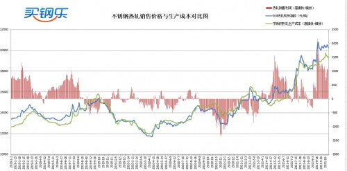 不锈钢使用高镍铁+镍板工艺冶炼304热轧生产成本约为19270元/吨,热轧销售价格高于生产成本1030元/吨。