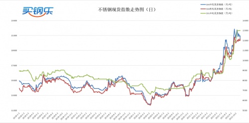 买钢乐不锈钢电子交易304冷轧连三品种收盘于17970元/吨,较上周下跌1530 元/吨,跌幅7.85%;买钢乐304冷轧现货指数收于20630元/吨,较上周下跌500元/吨,涨幅2.37%;304热轧现货指数收于20300元/吨,较上周持平;201J2冷轧现货指数收于12300元/吨,较上周下跌200元/吨,跌幅1.6%。