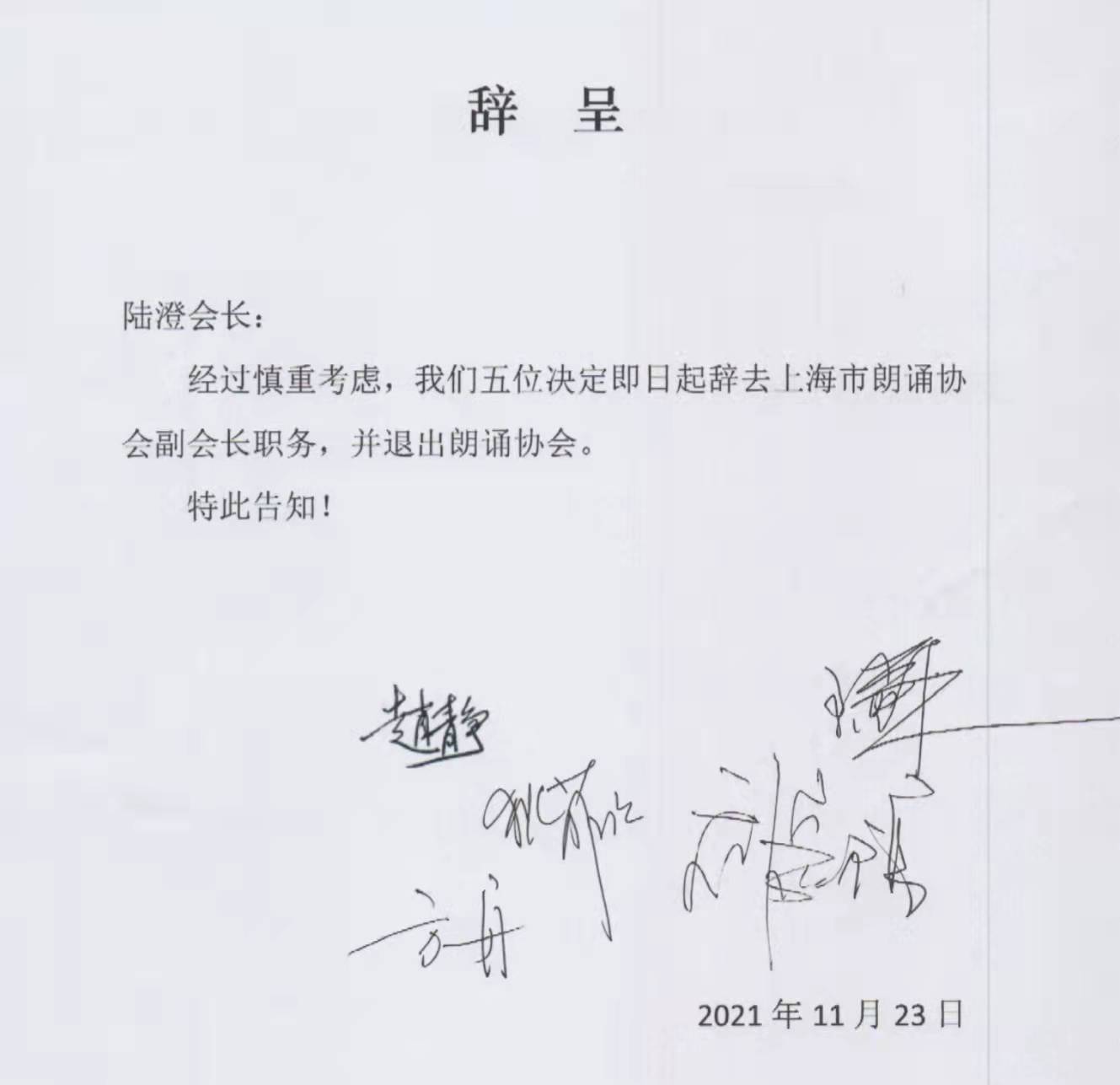 上海市朗诵协会5位原协会副会长辞职