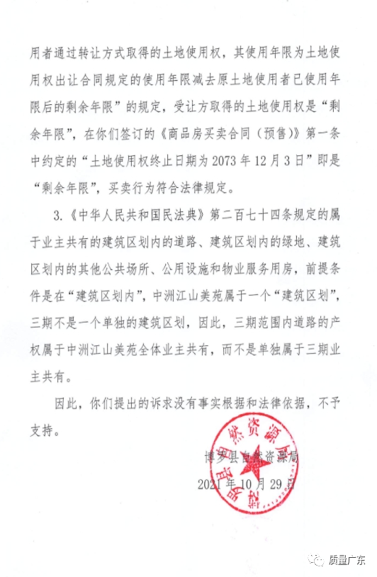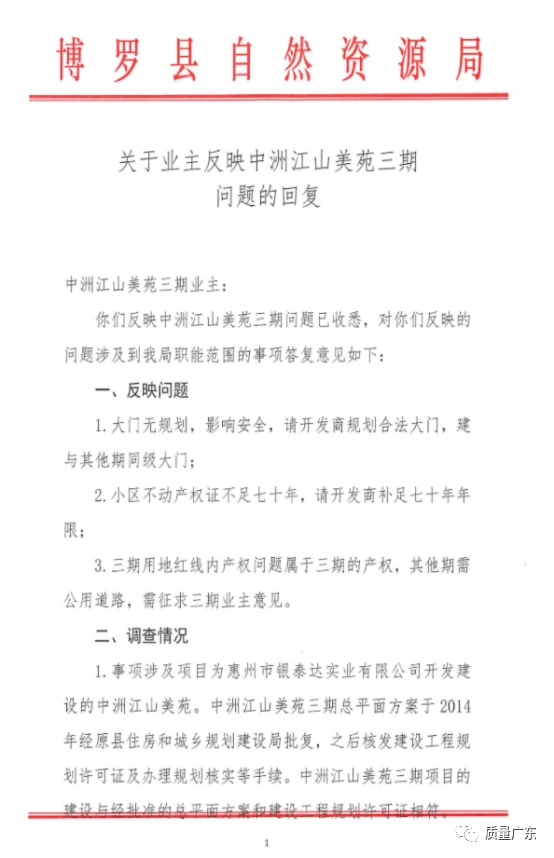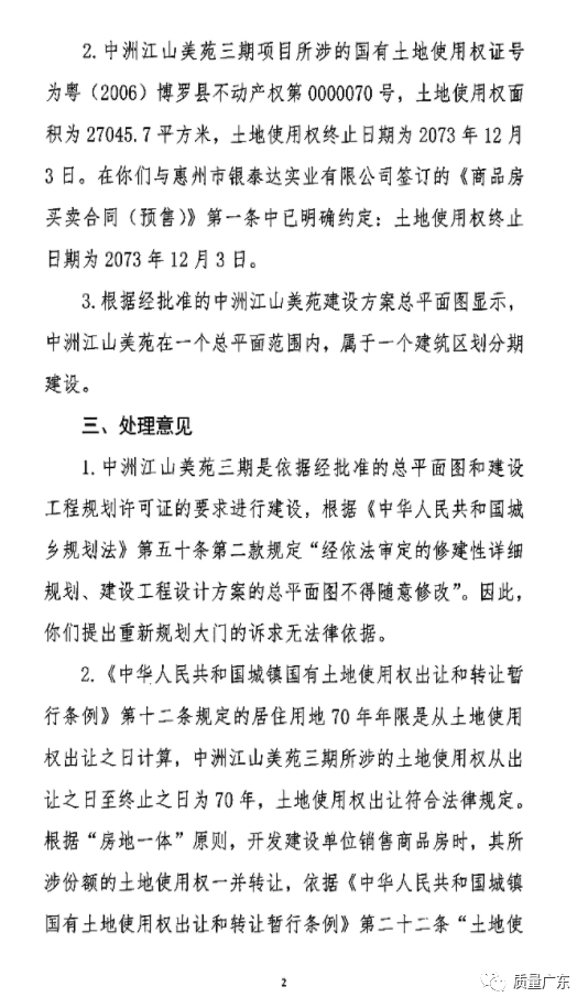 开发商对此也作出了细致解答:江山美苑三期项目系依据经批准的总平面图和建设工程规划许可证等文件要求进行建设,在销售过程中亦在销售现场公示了相关文件。在依法通过竣工验收合格并取得了竣工验收备案文件后于2019年12月20日至12月23日期间交付给业主使用。我司按图施工、依法获得相关竣工验收备案文件、依法依约向业主完成交付。前期并无门楼设计展示,业主在收楼时并未因配套设施与购房时存在落差或者因配套设施不足等问题而提出任何异议或者拒绝收楼。现阶段业主要求在没有规划许可的情况下另外增设门楼不符合相关规范要求。且该问题博罗县自然资源局已于2021年10月29日做出书面回复。