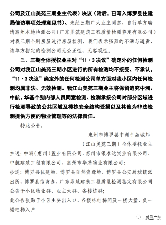 2021年12月28日业主代表得知中洲开发商自己找了惠州本地公司计划强行检测后,发出公告张贴在小区各区域: