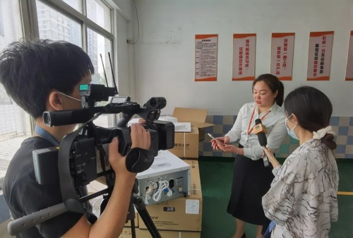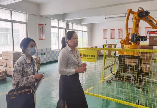 采访结束后,昊森陈欢总经理和黄圃电视台记者一同参观二楼自动化生产车间。并向黄圃电视台记者介绍了生产装配车间各流程和演示了产品溯源系统。