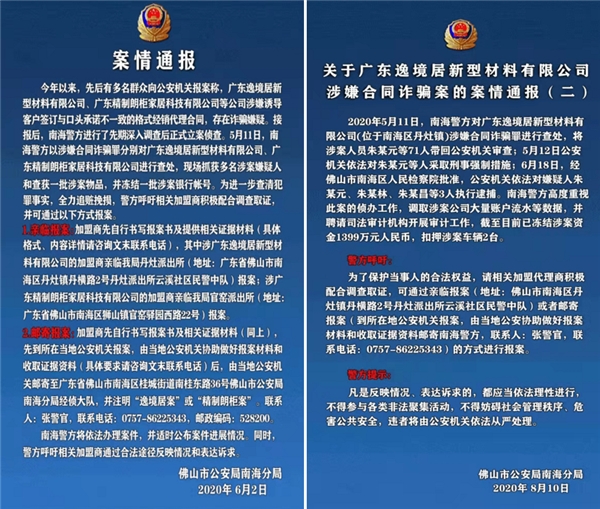 1、2019年年底,佛山市公安局南海分局陆续收到了数百宗报案。逸境居公司以加盟可抵扣购房费的噱头吸引受害人,诱导受害人签订与口头承诺不一致的格式经销代理合同,存在诈骗嫌疑。经过努力,佛山市公安局南海分局成功侦破这起全国首例“套路加盟”诈骗案。2020年5月11日,佛山市公安局南海分局以涉嫌合同诈骗罪对逸境居公司进行查处,现场抓获多名涉案嫌疑人和查获一批涉案物品,并冻结一批涉案银行账号。佛山市公安局南海分局高度重视此案的侦办工作,2020年10月11日,佛山市公安局南海分局对这宗全国首例加盟类诈骗案展开收网行动。行动中,警方共抓获朱自元(广东逸境居新型材料有限公司主要负责人)等犯罪嫌疑人75名,冻结涉案账户114个共1706万元。