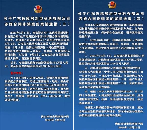 2、据佛山市公安局南海分局侦查,逸境居公司从成立至案发,未有一幢建设完成的轻钢别墅交付客户。极少数自建客户已安装好的轻钢龙骨,所用轻钢规格均与逸境居公司内样板间存在明显差异,轻钢材料相对纤细单薄许多。逸境居公司收取自建轻钢别墅客户资金后,不计入公司账薄,只投入少部分资金配料,并迅速转移大部分资金。案发后,全国各地每天都有数量不等的被害人至公安机关报案,实际涉案金额特别巨大。自2019年11月开始,共有485名被害人向公安机关报案,被骗金额合计7417355 2.93元人民币(含已退给41名被害人款项6730080元人民币)。在逸境居公司财务人员制作的公司内账中,两间逸境居公司共收取客户款项9000多万人民币,但退还客户款项总额仅1000多万人民币。