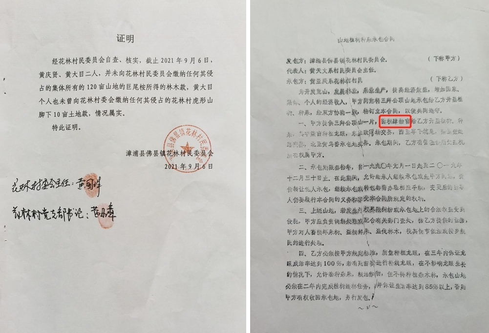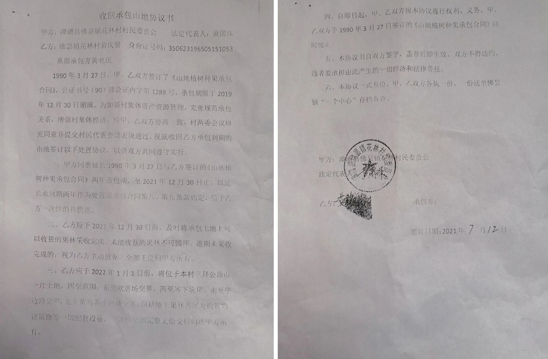(五)2021年7月26日左右,时任村委会主任黄国珠召开了村两委会会议,会议讨论了如何收回被黄庆贤、黄大目侵占的120亩山地等事项,却蹊跷的出现了2021年7月12日黄庆贤与花林村委会签订的《收回承包山地协议书》(见上图),众多村民质疑黄庆贤与现任村书记黄国珠在此时间段有利益输送,《收回承包山地协议书》系涉嫌伪造。《收回承包山地协议书》和2021年9月6日村委会出具的《证明》及村两委会会议,在时间和内容上有矛盾。《证明》中清楚地表述了黄庆贤、黄大目2人未缴纳侵占集体所有的120亩山地款,黄大目1人另还侵占10亩山地,也未缴纳山地款。黄庆贤(又名黄亚庆)仅有一份1990年3月27日与村委会签订的承包40亩山地的公正合同(见上图),却胆大妄为伙同黄大目霸占了120亩山地,非法收益、中饱私囊长达31年之久,其行为涉嫌违法违纪并严重侵害了村集体财产权益。2021年9月6日,500多名村民联名举报至漳州市纪委、漳浦县纪委。后,漳浦县纪委介入调查,2012年12月下旬漳浦县纪委致电村民黄景方,说,黄庆贤、黄大目缴纳了2015年销售树木款的15%计4.2万元给村委会,并已无代价的将山地归还给村委会。