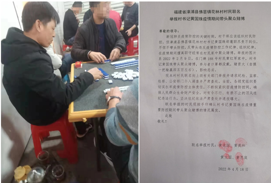 (七)新冠肺炎疫情防控的关键时期,村干部应组织村民防控,但漳浦县佛昙镇花林村村书记黄国珠却履职尽责不到位,不但不带头防控,反带头违反疫情防控工作纪律、组织纪律,在疫情期间擅离职守经常在村民家中聚众赌博。上图系2022年2月9日,在村民黄红军家中,村书记黄国珠(上图左一)带头聚众赌博,参与者口罩都没戴,赌资大(自摸一把输赢四五百左右),影响恶劣。花林村4个村民联名举报黄国珠在疫情重要防控期间带头聚众赌博,影响恶劣。请纪检、监察、检察、公安部门介入调查并启动问责程序。