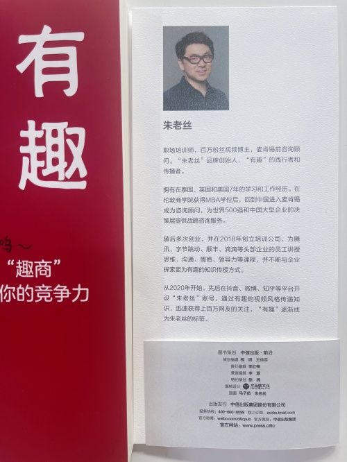 除了研究“有趣的人”和“趣商”,朱老丝本人也是一个幽默、有趣的人。他曾经是麦肯锡公司的咨询顾问,为世界500强以及国内顶尖企业的CEO提供战略咨询服务,但他经过几年的转型,成为了受广大网友喜爱的幽默风格视频博主,在抖音、小红书、知乎、微博等平台拥有几百万的粉丝。朱老丝也非常热爱生活,考取专业咖啡师资格证书、骑复古摩托、自学乐器、参与野外生存专业教练培训等。当然朱老丝的另一个主要身份还是职场培训师,为各行各业的企业员工进行授课,例如《有趣的表达》、《系统化思维》、《战略思维》等。