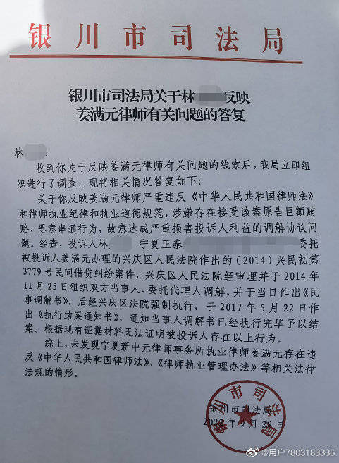林先生认为,姜满元作为自己的代理律师,为了谋求非法利益,严重违反律师执业道德和职业纪律,与对方当事人恶意串通并达成超出其诉请近300万元的调解协议,严重损害委托人巨额财产利益。当林先生质问姜满元律师并表示要投诉他时,对方表示“你告不倒我的,我上面有人”。林先生于是将姜满元律师的问题投诉到银川市司法局,但银川市司法局于2022年9月作出答复称,未发现姜满元存在违反相关法律法规的情形。司法局在答复中提到“法院组织双方当事人、委托代理人调解,并于当日作出《民事调解书》”,对此,林先生表示,自己并未出庭参加诉讼未参与调解,上述调解协议是在自己不知情的情况下由代理人姜满元与原告达成的。对于姜满元律师如此明显与对方当事人恶意串通损害委托人巨额财产权益的违法违纪行为,银川司法局竟然以“未发现姜满元存在违反相关法律法规的情形”搪塞林先生,似有包庇之嫌。