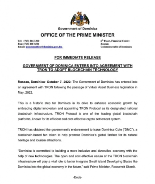 图说 :多米尼克与波场TRON达成的一系列合作的政府公文,网址详见:https://dominica.gov.dm/images/TRON_October_07.pdf https://dominica.gov.dm/images/documents/tron_DOC-20221009-WA0010.pdf