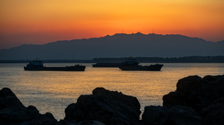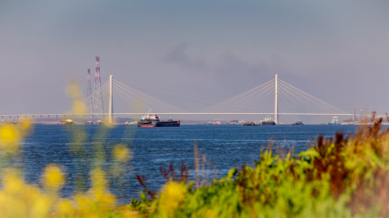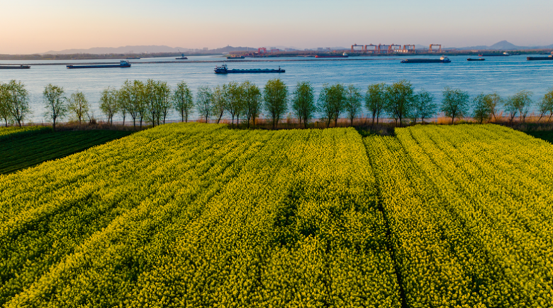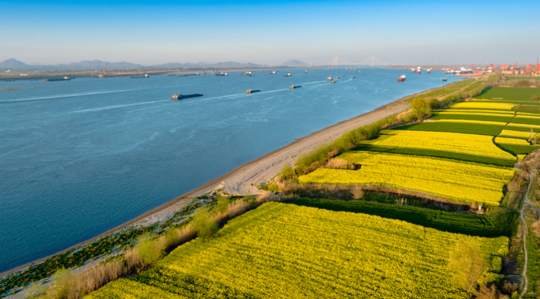 贵池区乌沙镇新义村长江边,有一处叫马石矶的地方,绿草如茵、菜花飘香。途经这段江面的船只每天熙熙攘攘、川流不息。江水映着蓝天,加上浅滩上千姿百态的石头,构成了一幅明媚多姿的春日水彩画。