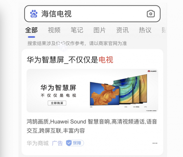 在这种激烈的市场竞争之下,华为通过购买竞品关键词蹭热点蹭流量的商业行为或可理解,但作为搜索引擎主流平台的百度,却一心向钱看,把“海信电视”关键词出售给华为,失去了搜索平台的中立性,有违公平。