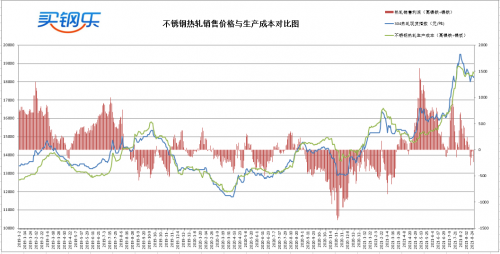 不锈钢使用高镍铁+镍板工艺冶炼304热轧生产成本约为18430元/吨,热轧销售价格低于生产成本233元/吨。