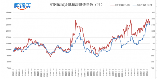 买钢乐高镍铁指数收于1435元/镍,较上周上涨35元/镍,涨幅2.5%。;电解镍指数收于143450元/吨,较上周上涨1270元/吨,涨幅0.89%。